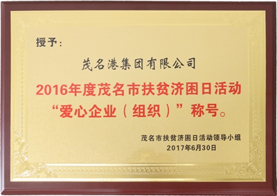 2016年度茂名市扶貧濟(jì)困日活動(dòng)“愛(ài)心企業(yè)(組織)”稱號(hào)
