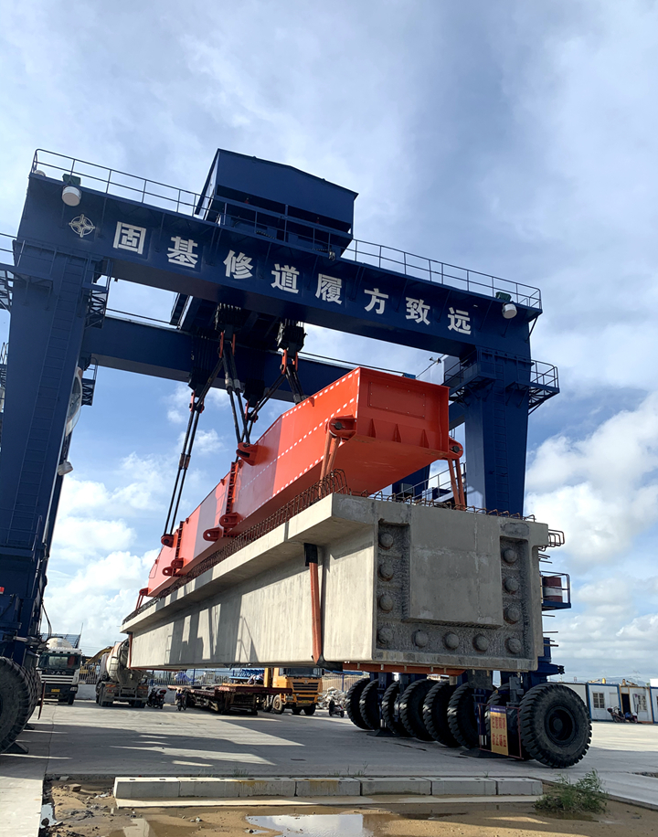 本工程新建1個10萬噸級油品泊位、4384米公用管廊及配套設(shè)施。其中陸域公用管廊棧橋上部結(jié)構(gòu)采用預(yù)應(yīng)力箱梁結(jié)構(gòu),單榀箱梁凈跨長30.64m,高度為2m,寬度為3.6m,共計有200件,單件重280噸,采用后張法工藝進行施工,均采用C55高性能混凝土進行預(yù)制。