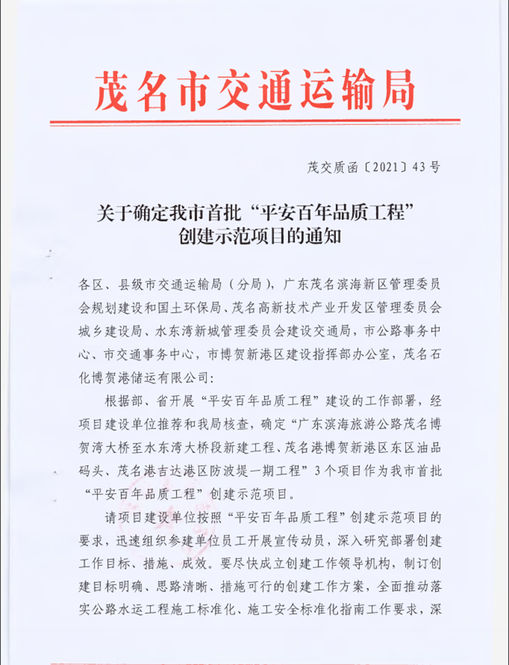 近日,茂名市交通運(yùn)輸局在全市公路水運(yùn)項(xiàng)目中開展“平安百年品質(zhì)工程”創(chuàng)建示范工作。經(jīng)過層層選拔,茂名港博賀新港區(qū)東區(qū)油品碼頭工程脫穎而出,成為茂名市首批“平安百年品質(zhì)工程”創(chuàng)建示范項(xiàng)目!