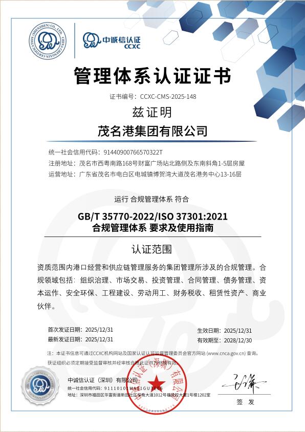 近日,茂名港集團(tuán)有限公司成功通過(guò)權(quán)威認(rèn)證機(jī)構(gòu)審核,榮獲ISO 37301:2021合規(guī)管理體系國(guó)際標(biāo)準(zhǔn)認(rèn)證與GB/T 35770-2022合規(guī)管理體系國(guó)內(nèi)標(biāo)準(zhǔn)認(rèn)證。這標(biāo)志著茂名港集團(tuán)在合規(guī)管理體系建設(shè)方面達(dá)到了國(guó)際國(guó)內(nèi)先進(jìn)水平,成為茂名市首家獲得合規(guī)管理體系認(rèn)證的市屬?lài)?guó)有企業(yè),在企業(yè)治理現(xiàn)代化與規(guī)范化道路上邁出了具有里程碑意義的關(guān)鍵一步。