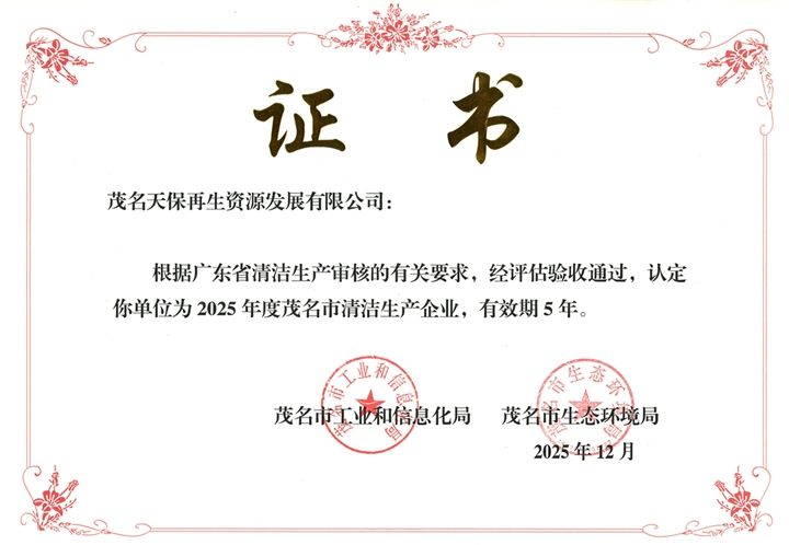 茂名天保再生資源發(fā)展有限公司正式確定為茂名市2025年度清潔生產(chǎn)企業(yè)